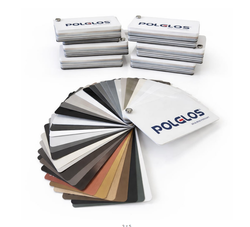 Color swatch Polglos – wzornik listkowy płyt meblowych Polglos zawiera 45 dekorów w formie laminatów – dekory Polglos High Gloss i Polglos Super Matt