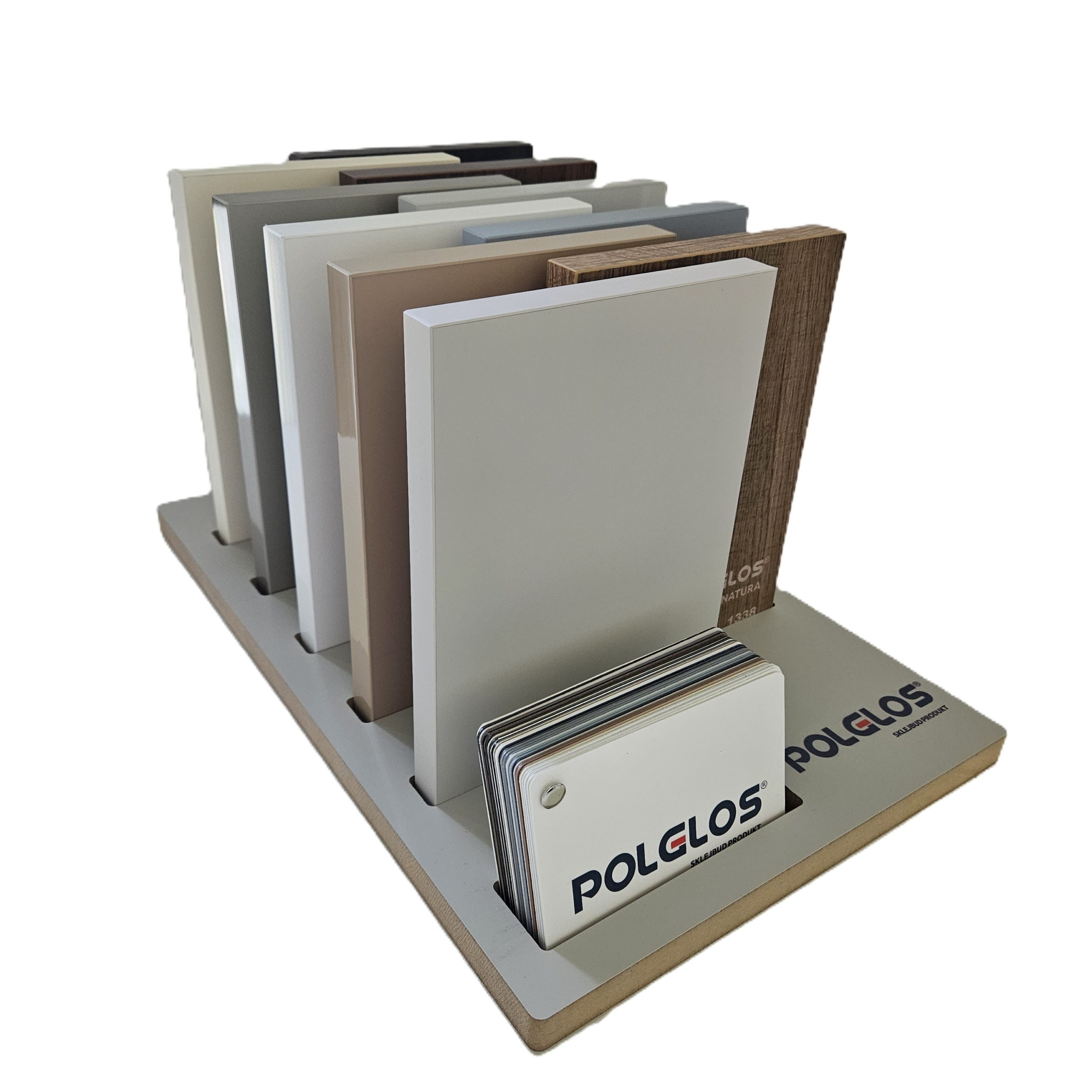 Ekspozytor biurkowy Polglos z 10 wybranymi próbkami płyt meblowych Polglos lub Polglos Natura oraz wzornikiem